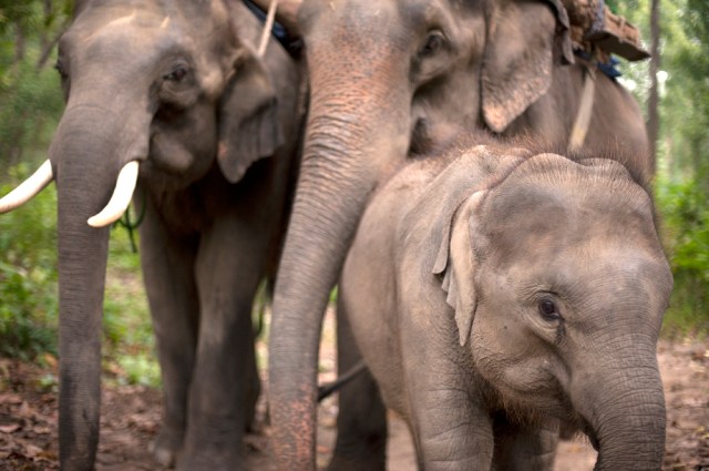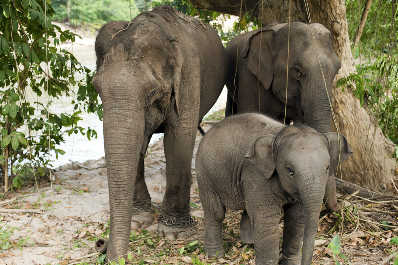 | Dani (Left) with her Daughter and Grandson. Unfortunately, Dani was going to be sold to a known street begging operator in Surin. ENP intervened and purchased Dani so she could retire from her working days. It was not known until the day of Dani’s rescue that she had a daughter and a grandson. |