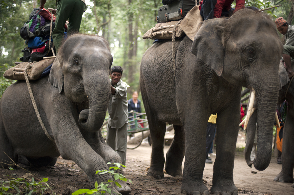 So our first experince with these amazing creatures was riding on a safari hunt for the Indian Rhinoceros. Funnily enough, after reading up about Chitwan National Park I discovered that the Asian Elephant is more endangered that the Indian Rhinoceros, so we were riding an Endangered Species to photograph a Vulnerable Species! We rode on a lovely, calm ele who had a young bull calf, he rang along beside us and his mother and could barely keep up on the journey back, he looked to be only 1 or 2 years old. The Mahout did have a metal hook which I saw him use twice. He struck the elephant hard on the top of its head when she wouldn’t step up a small river bank, he also struck her when she was apparently walking too slowly. Each time the mahout struck the elephant we both had our hearts in our throats and Chantelle almost jumped off the elephant in disgust.