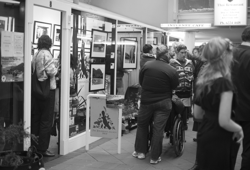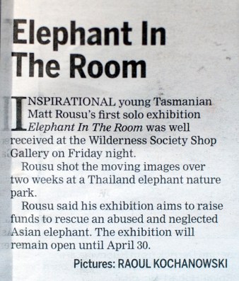 When we arrived home to in late December 2010 I immediately began organising how to help, I didn’t want to let that feeling go so I booked in an exhibition slot for March/April of 2011 at The Wilderness Society Gallery in Hobart, TAS. So I had given myself 2 months to organise a professional exhibition of my own photographs captured at ENP. Considering it was the busiest time of year at work (cheffing at Cargo Bar Pizza Lounge) and I had used up all of my leave, there were a few sleepless nights to get everything organised in time. I called the exhibition Elephant In The Room (Well Chantelle thought of the name).