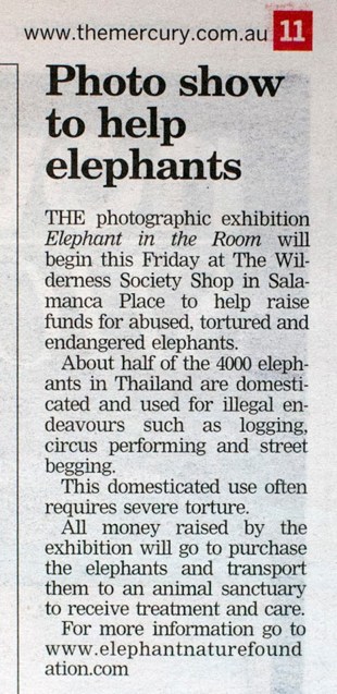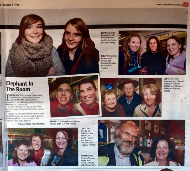 March 4th and opening night finally arrived and Dave (friend from Melbourne), Chantelle and I had literally just finished setting up about 15 minutes before the first guests arrived. I’d organised a couple of cases of Chang Beer as well as wine and bubbles for the night and after a hectic few days I calmed down after a couple of Ele beers. The night ended up being a huge success, Bill Harvey (an alderman for Hobart Council) opened the show with a short speech, followed by me talking a bit about the plight of the elephants and what we can do to help. Friends (Toni and Jo) who I met at The Elephant Nature Park attended from thousands of Kilometres away and spoke about their experiences with the Asian elephants. We celebrated into the night and had sold a total of 9 photographs on opening night! Needless to say, I was ecstatic our fundraiser got off to such a great start.