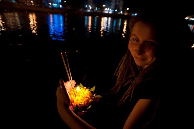 | Chantelle releasing her floating lantern into the river. |