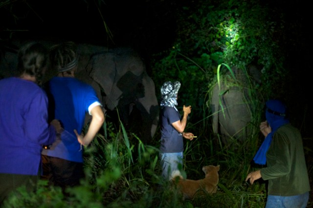 One of the highlights of our first week was our overnight stay up at Leks original property; Elephant Haven. We walked up into the jungle with Pom and Chet, accompanying us with elephants Hope, Jokia and Mae Perm. It was amazing staying up in the Jungle, looking for the elephants at night and tying blessed scarves around the trees to help protect them from logging. Pom told us many beautiful and funny stories about the elephants who now live in peace at ENP.