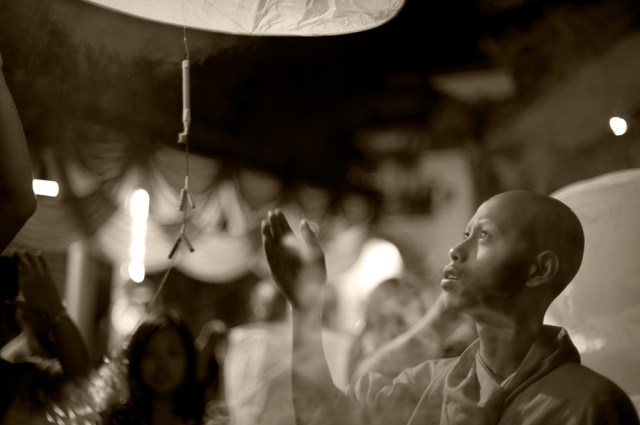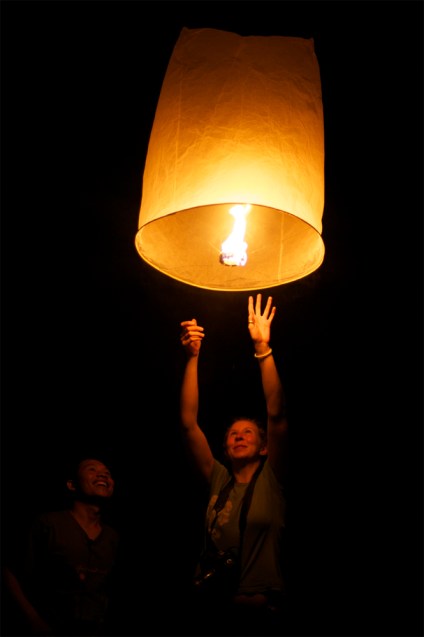 | A monk helped us light and release our floating lantern into the night sky. |