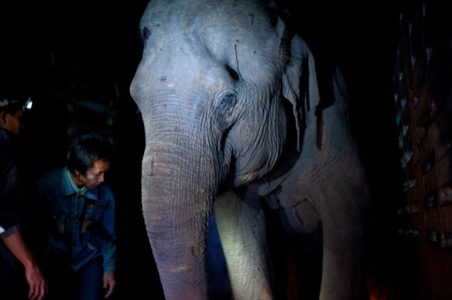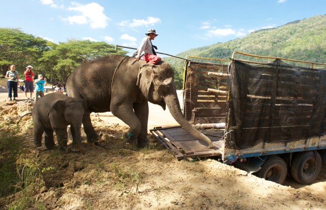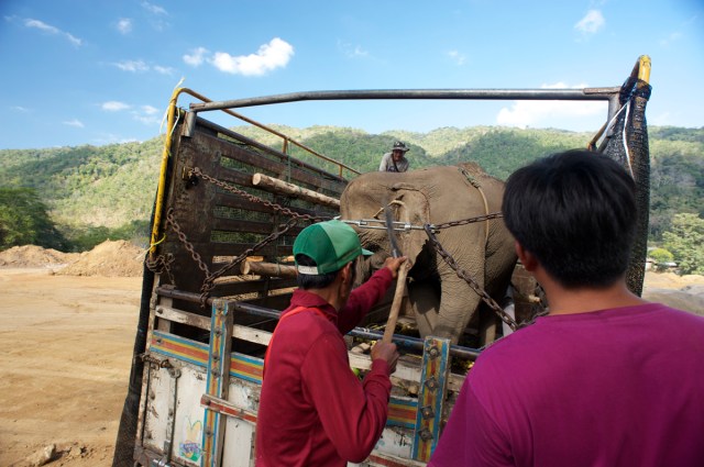 | Dani being led onto the truck by her previous mahout and saying goodbye to her grandson. This was a heartbreaking moment for us. |