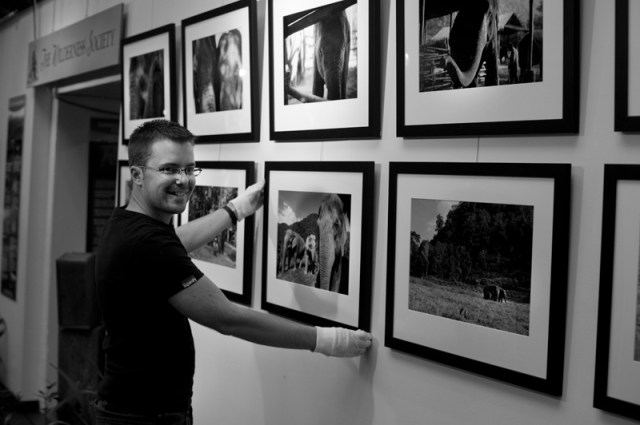 First I had to select and edit a suitable number of photographs that had the potential to look great on the wall, step two was finding a professional printer and custom framer to realise my ideas. This process was great fun and brought back many fond memories of my studies of Photography at University. Eventually I settled on 23 photographs, 17 stand alone portraits of the elephants at ENP and a documentary series of Dani’s rescue. After getting the photographs sorted out, we turned to publicity. designing post cards, posters and a 20 page catalogue to accompany the exhibition and organising interviews with newspapers and magazines.