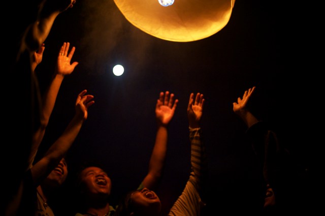 | Volunteer Co-ordinators Chet and Aek releasing their lantern, notice the full moon behind them. |