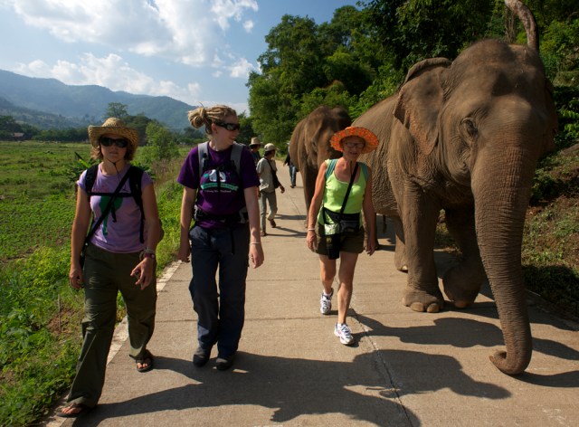| Sam, Chantelle and Pelote (Annie) on their way to Elephant Heaven with Jokia and Mae Perm. |