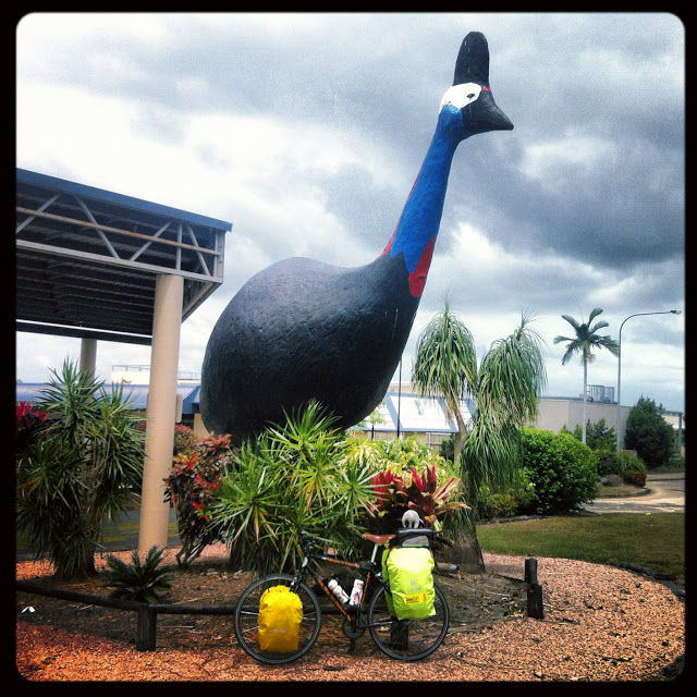 Day 54 threatened to be a stormy one and after only 15km it started pouring massive heavy droplets of tropical rain. I thought it would only last a few minutes and kept on riding yet after 20 minutes I was completely soaked and getting cold. I powered through the downpour at over 35km per hour (over 10km faster than my average) to try and find some shelter. 10 minutes later I rolled into a rest stop and hunkered under shelter. After wringing out my soaked clothes and attempting to dry off my bags for 30 minutes the rain settled to a nice looking misty fog. Putting my damp clothes back on I headed back out thinking either the sun would come out and dry my clothes or it would keep raining and therefore I would only have one wet set of clothes. Fortunately it didn’t rain for the rest of the day and I slowly made my way down to the popular seaside destination of Mission Beach. Today also held the record for the most ‘Big Things’ in one days ride. The Big Crab at Cardwell, Big Gumboot at Tully and the Big Cassowary at Mission Beach. As a reward for 2 days of tough riding I booked a cabin for 2 nights so I could watch the AFL grand final and veg out before the last 2 days of riding.