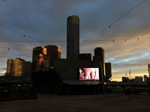 Jungle Boy up on the big screen as the sun sets over Melbourne