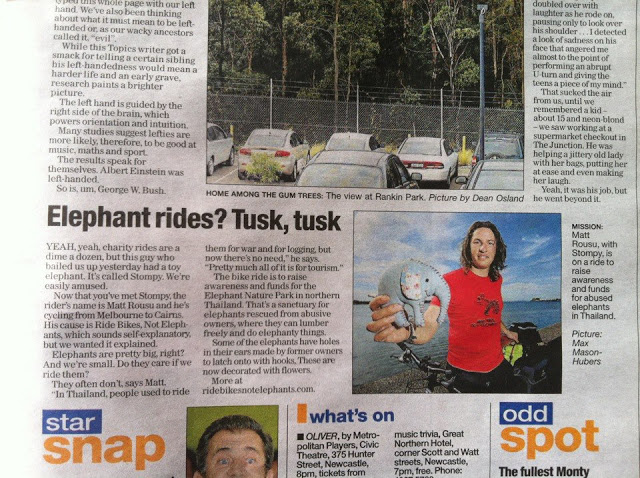 The next stop was Newcastle, right on the coast with perfect blue skies and warm temperatures it was tempting to stop for a few days. I rolled in around lunch time on Tuesday the 14th of August and immediately tee’d up a photo shoot and interview with the Newcastle Herald. They were 2 young guys who came down to the esplanade to meet up and chat, I was pretty happy with how it all went and was confident the article would be pretty good. Alas they pretty much took what I said and threw it in the bin, they were alot happier trying to make me look like kids entertainment by making Stompy the focus. It was a toy elephant who was the highlight of both the photo and the first paragraph of the article. Well it may be funny to them, but the torture of Asia’s elephants is not funny at all. As you can imagine I was a little annoyed that they wern’t brave enough to actually report the truth of elephant tourism…
