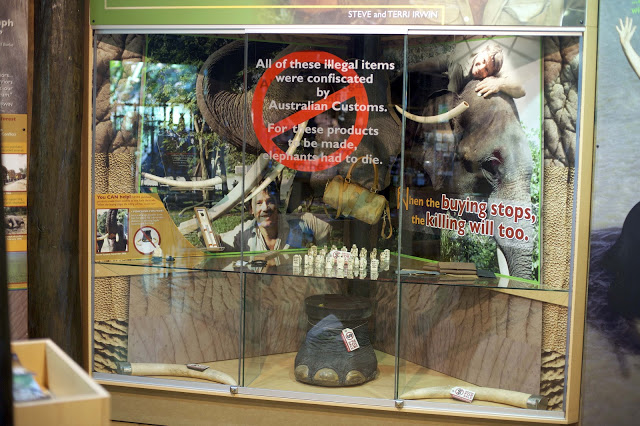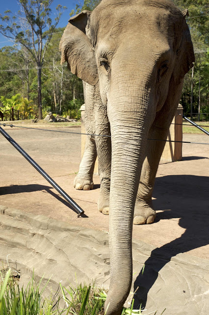 I arrived early to avoid the crowds and pretty much immediately went to the elephant enclosure, they have a specific elephant gift shop called Elephantasia alongside which I visited first. I was immediately impressed as there is no elephant tourism pictures or information, they do however have a whole wall dedicated to elephant conservation efforts as well as Australian customs confiscated ivory items on display with the clear message to avoid purchasing any ivory or animal products while travelling abroad. After taking some pics of the display I wandered down to the the 3 elephants to check out their enclosure. Grass, sprinklers, a pool and heaps of food growing around the boundary, I was also later told that the elephants have 70 acres of land which they get to use often. The elephants themselves Siam, Sabu and Bimbo are all in their 50s and still owned by the Bullen family, they were apart of the Bullen Circus for many years but since 2003 they have been at Australia Park Zoo in retirement.