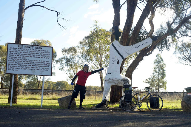 Day 4 was the first annoying day of the ride, Euroa to Glenrowan with a headwind all day long. I could barely get up to 20km/h. The wind was to be a constant love affair throughout the ride, some days it was an angel on your shoulder giving you wings, yet other days would have you slogging through wet concrete. I caught up with my Uncle and Auntie at Benalla for a quick coffee before the final slog to Glenrowan, the famous town of Ned Kelly the bush ranger.