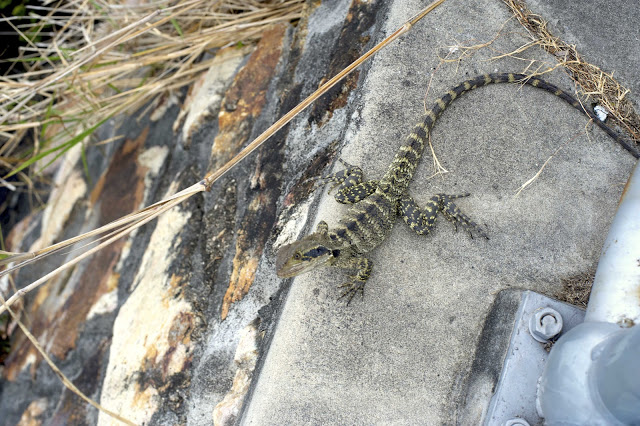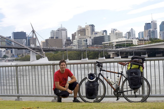 Day 32: From Springwood in the south of Brisbane I found a bicycle path that ran alongside the Motorway (which is illegal for me to ride on), it was nice not to have to deal with traffic however it was slow going as I had to cross roads at pedestrian crossings and deal with the ever present bump, bump, bump, bump of the concrete joins in the path. After 25km I had arrived on the river overlooking the city, it was a nice place to stop for a banana and there were these cute lizards who were very curious, I then crossed over a new foot bridge to enter the city centre. I rode alongside the river for a short while before I had to finally ride on the roads. Well, from there until the Northern suburbs was the real slow part of the day, there seemed to be no easy way out of the city in a North/Easterly direction which allowed bikes on it. I criss crossed many roads before finally after 4 hours I was out!!! I then cruised into Deception Bay and was happy to be back on the wheels…
