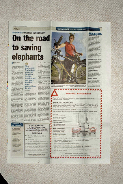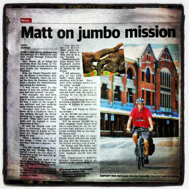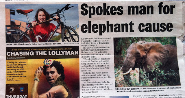 Days 43, 44 and 45(September 14-16) were the most remote days of the ride. I stayed out the back of roadhouses and in very old caravan parks with no other guests. It was fantastic! I’ve been reading Alastair Humphreys book called Moods of Future Joys: Around The World By Bike and I’ve adopted one of his mantras which is “Miles Not Smiles”. These past 3 days I rode 320km. I encountered a 8km detour as an accident occurred on the Bruce Highway, 4 supersize trucks hauling loads that took up both lanes, these trucks needed a police escort to guide traffic out of the way, I rode through about 40km of roadworks and was stopped for a total of 25min because of said roadworks. I was rained on for about 15 minutes, 5 minutes of this being at the really annoying time when my gear and tent were half packed up! I was given free coffee at Outback Gems on the Bruce Highway and performed minor surgery on my big toe (well, I basically dug my big toe nail up as it was growing down into my toe). It was also during these days that I cracked the 3000km mark of the ride! There were no real towns, just roadhouses and 2 caravan parks. I only realised how fantastic it was being out there when I rode into the next big town, all I wanted to do was get back on the bike and ride. The bright lights, thousands of people and supermarkets with long shopping aisles really inspire me to get out there and find the remote roads of the world, to meet people out in the middle of these places and basically to just keep riding! But, first things first. The aim of Ride Bikes, Not Elephants is to visit the populated east coast of Australia and raise awareness for the elephants. So, I organised an interview with the Mackay Daily Mercury and an interview with the Townsville Sun. Yes! 3200km down, only 800km to go!!! |