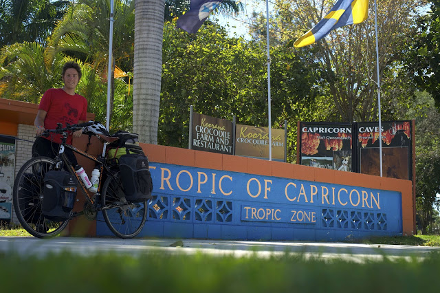 That was until I rode out of town the next day through the mega industrial zone, I counted 6 massive sites all revolving around mining, gas, coal and explosives. For me the most frightening part was the trucks. I rode 10km and counted 150 trucks, that’s one truck for every 67 metres!!! I was worn out after that first 10km but still had to ride another 100km to Rockhampton. Had some fantastic stretches of road today as the traffic control at the many roadworks meant I had no traffic for long periods and I loved being able to safely ride on the road and not on the shoulder. The information centre at Rockhampton recommended I visit the local rodeo, this was after I told them about my trying to raise awareness about animal cruelty. Anyway… Rockhampton actually became one of my least favourite stops for two more reasons; The local paper were not interested in writing an article because I am fundraising for an overseas charity and the local bike shop who serviced my bike left me with only 6 workable gears out of my 27! I was very happy to pedal out on  September 14th. I did however, cross over the Tropic Of Capricorn and enter Australia’s tropic zone. |
