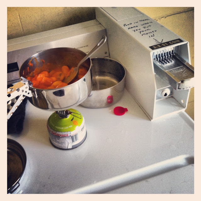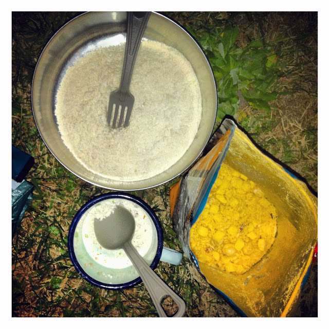 Typical dinner when there are no cooking facilities. Mash potato with soupl and freeze dried Chana Masala