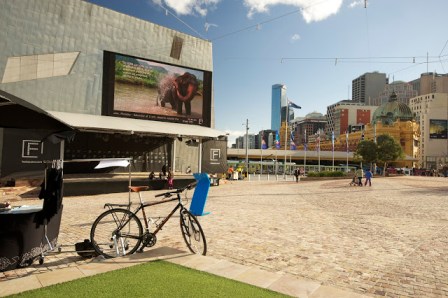 It began in Federation Square in Melbourne on July 18th, 2012. Chantelle and I were lucky enough to secure a marquee in the square for 3 days before I set out on the ride. It was a fantastic opportunity to raise awareness as it is an award winning tourist destination in Melbourne, we arrived on a cool and windy Wednesday morning and were immediately drawn to the famous Big Screen which was playing our 4 minute movie and would continue to play for the remainder of the week. I must say it was amazing to see our photographs and video of Elephant Nature Parks elephants up on one of Australia’s most famous TVs! Our friend Dylan Hammond let us use one of his music tracks as well…