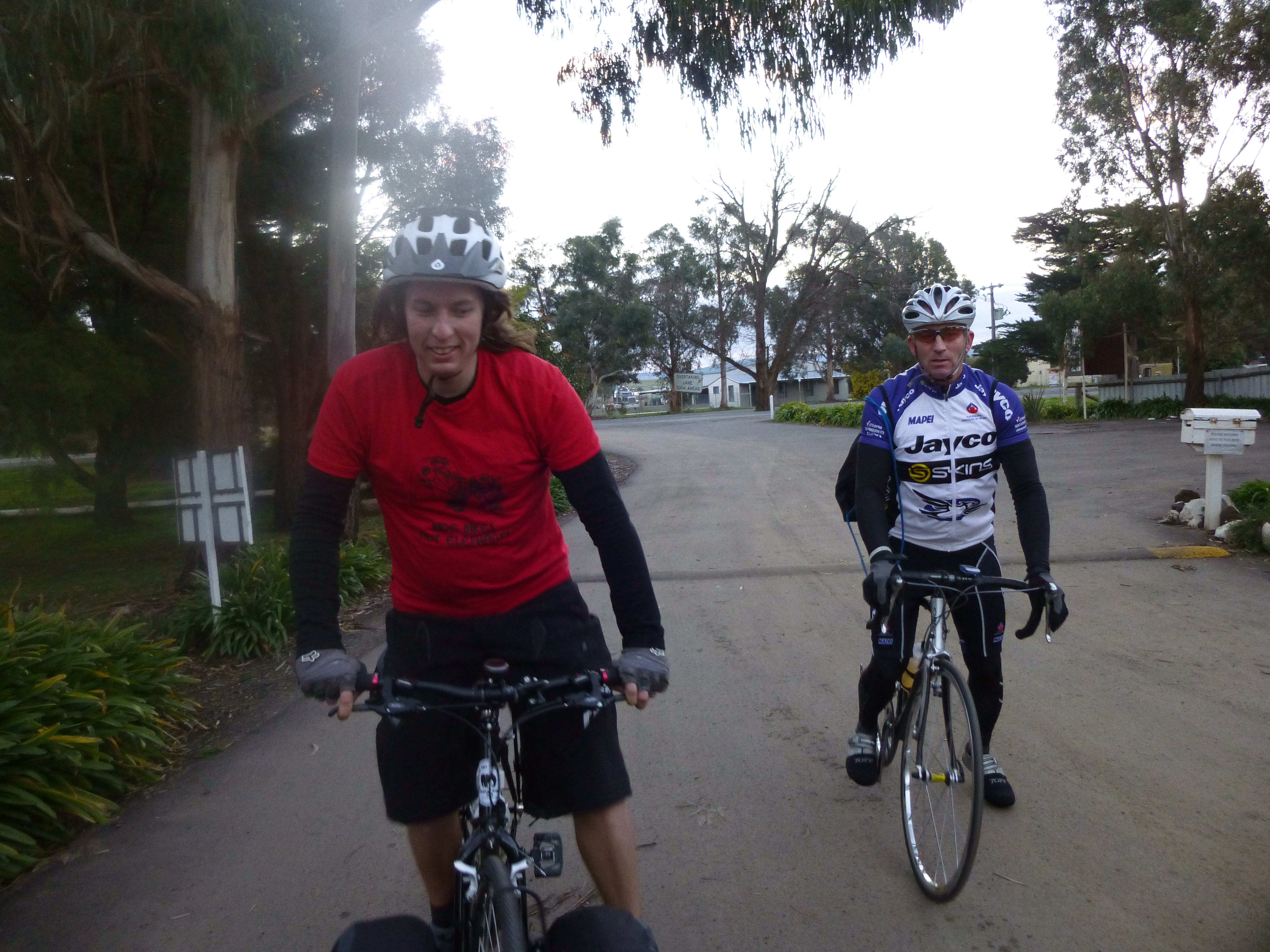 On day 6 I rode from Wangaratta to Albury after a damp night in the tent and a slow pack up in the drizzly morning, I stuck to the Hume Highway and therefore was also stuck with the loud trucks and constant traffic. I bumped into some good friends Daniel, Neil and Gerry Van Der Ploeg in Albury, these guys are cycling superstars in my eyes and it was really nice to bump into them and show them my bike and its 50-60kg of weight!