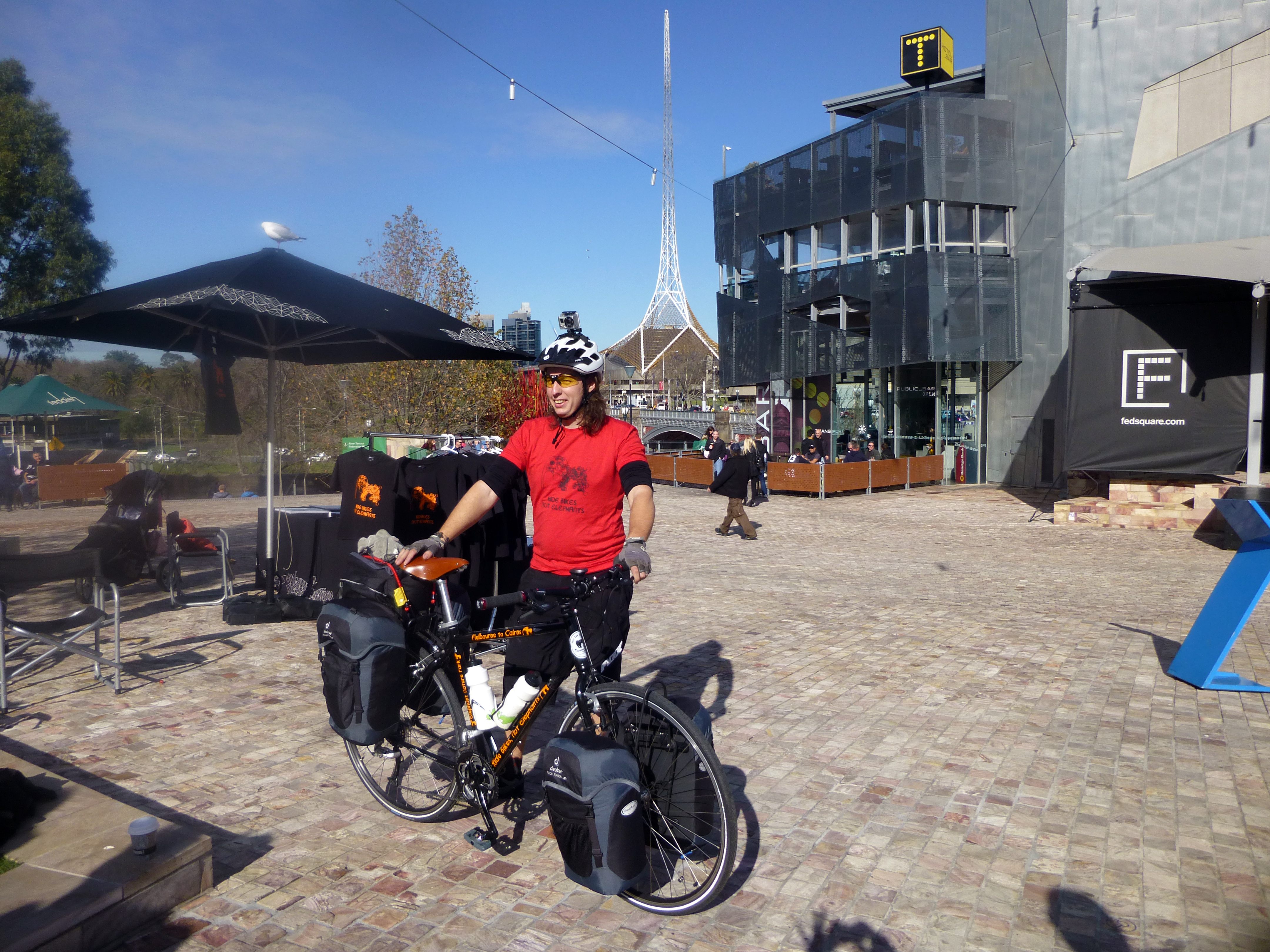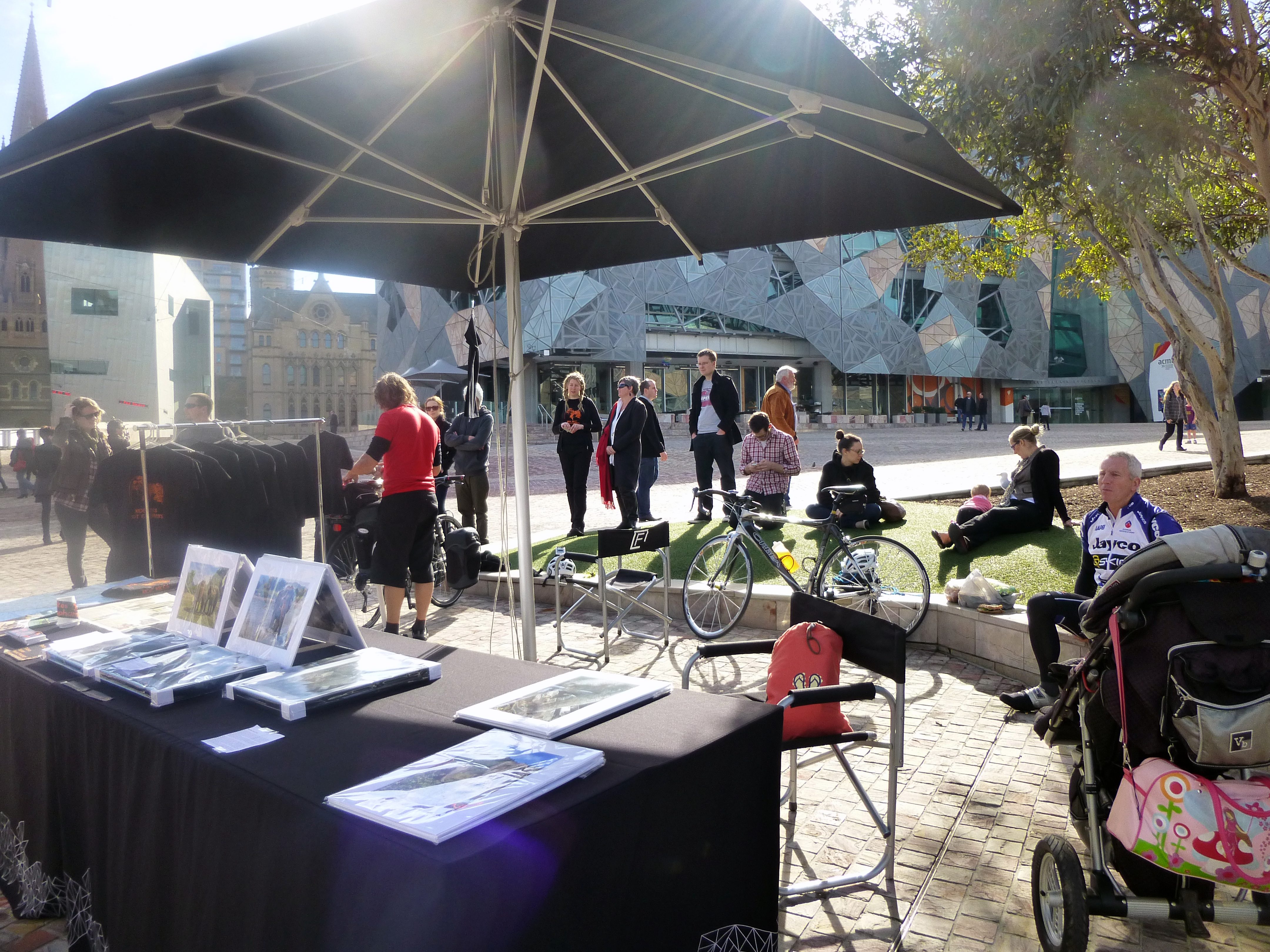 It began in Federation Square in Melbourne on July 18th, 2012. Chantelle and I were lucky enough to secure a marquee in the square for 3 days before I set out on the ride. It was a fantastic opportunity to raise awareness as it is an award winning tourist destination in Melbourne, we arrived on a cool and windy Wednesday morning and were immediately drawn to the famous Big Screen which was playing our 4 minute movie and would continue to play for the remainder of the week. I must say it was amazing to see our photographs and video of Elephant Nature Parks elephants up on one of Australia’s most famous TVs! Our friend Dylan Hammond let us use one of his music tracks as well…